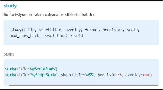 Grafikte görünecek göstergenin adını ve kısa adını tanımladık, Grafiğin neresinde gösterileceğini görüneceğini overlay= komutuyla betimledik. Altında görünmesini istiyorsak “false” fonksiyonunu, Üstünde; barlara örtüşük olarak kullanılmasını istiyorsak “true” fonksiyonunu kullanıyoruz. fonksiyonunu Osilatörelerde (örn: rsi,macd) alt kısımda (), Hareketli Ortalamalarda ise grafik üstünde barlara örtüşük () kullanmalıyız.
